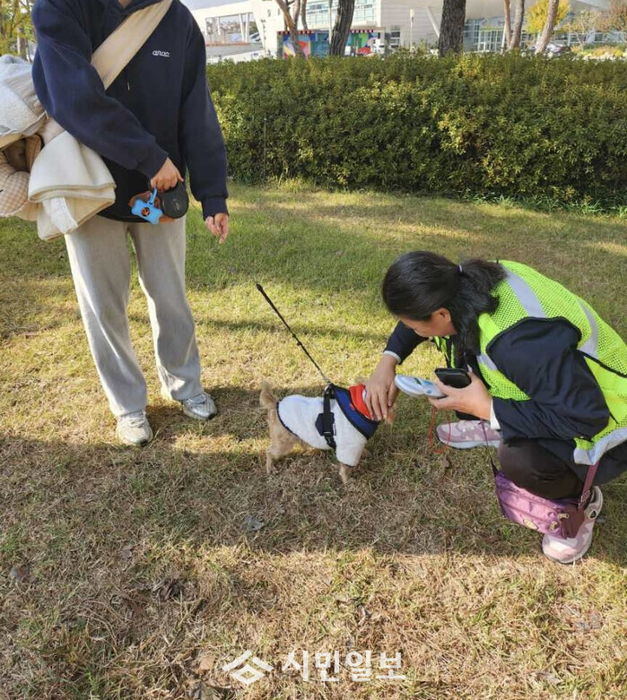 | ▲ 산책나온 애완견과 마주한 명예동물보호관 자료사진 / 광주광역시 제공 |