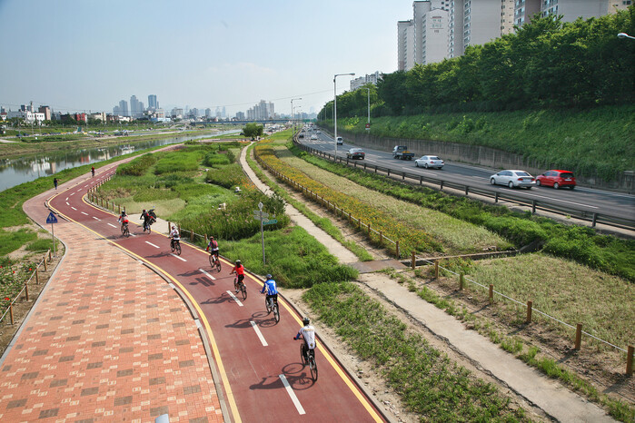 | ▲ 중랑천변 자전거길에서 자전거 타는 시민들. |