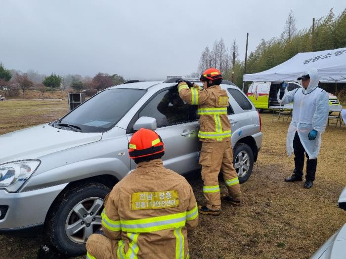 | ▲ 강진소방서 소방관들이 지난 24일 장흥군 소재 전남도립대학교 장흥캠퍼스 운동장에서 열린 제2회 전남 생활안전 기술경연대회에 참가해 차량문 개방 경연을 실시하고 있다. / 강진소방서 제공 |