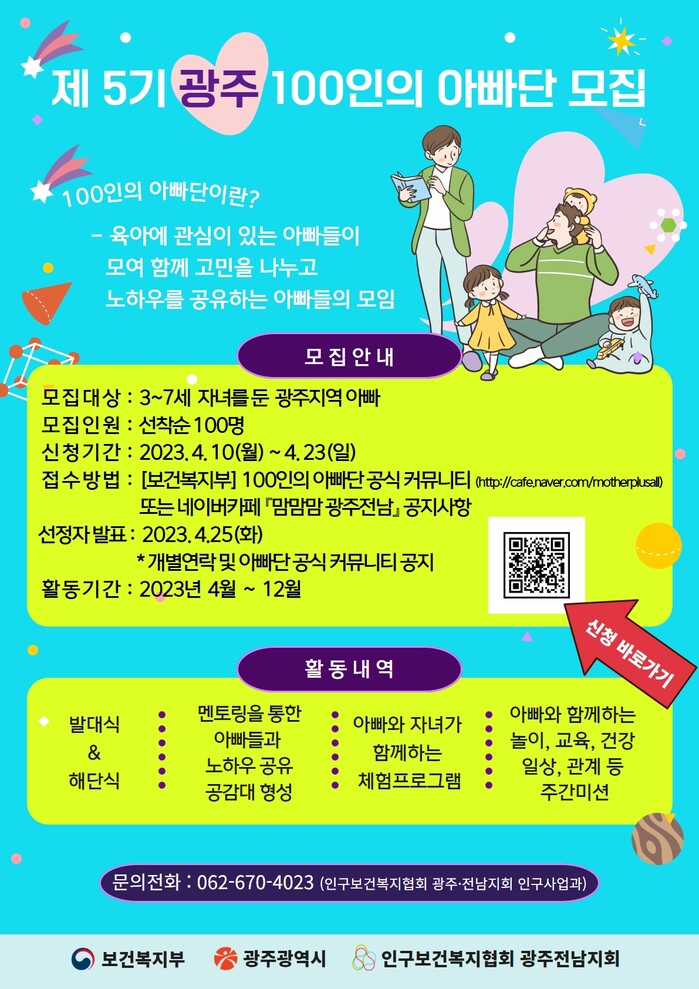 참가신청은 네이버 카페 ‘100인의 아빠단 공식 커뮤니티’ 또는 ‘맘맘맘 광주전남’에서 할 수 있다. 선정 결과는 오는 25일 발표한다.