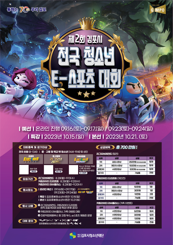 리그오브레전드는 9월 13일까지, 카트라이더 드리프트와 카트라이더 러쉬플러스는 오는 9월 20일까지 모집하며 포스터 QR코드 혹은, VSS.GG 홈페이지에서 참가접수 할 수 있다. 대회 관련 문의는 접수 홈페이지인 VSS.GG 혹은 김포중봉청소년수련관 문화활동팀으로 하면 된다.