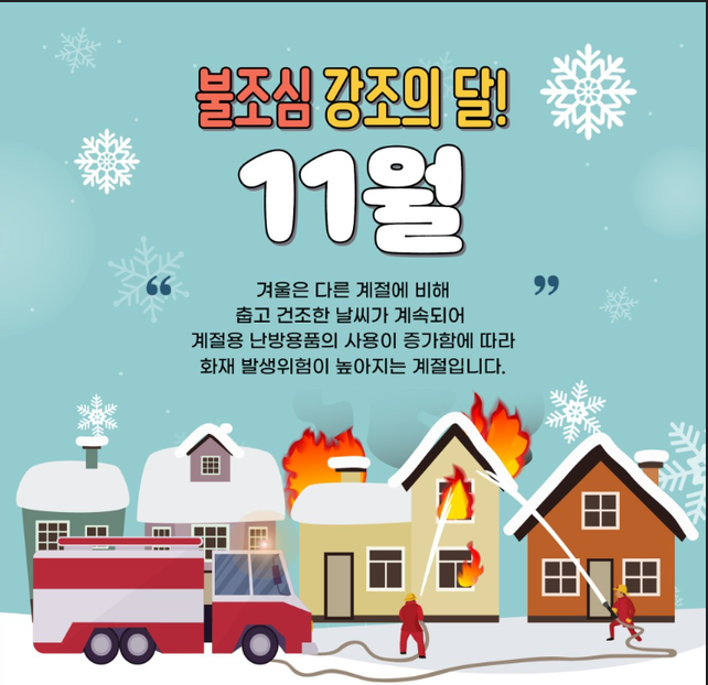 한편, 소방청에 따르면 최근 5년간 겨울철 화재는 평균 1만1296건이 발생했다. 화재원인으로는 부주의(50.8%), 전기적 요인(22.3%), 기계적 요인(11.2%)이다.