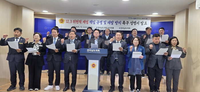 [남악=황승순 기자]전남도의회는 도의회 프리핑룸에서 12.3 위헌적 계엄에과 관련 책임 규명 및 재발 방지을 촉구하는 성명을 발표했다.