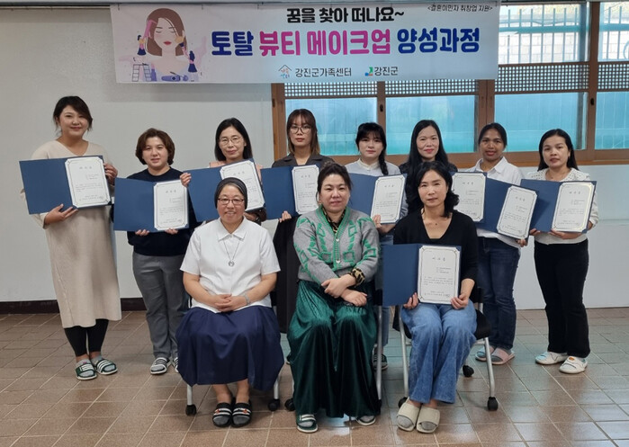 | ▲ 강진군 가족센터, 지난 11일 토탈뷰티 메이크업 양성과정 이수증 수여 후 기념촬영 / 강진군 제공 |