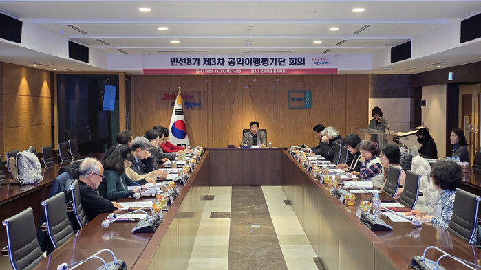 | ▲ 군포시는 11월 27일 시청 중회의실에서 공약이행률을 높이기 위한 공약이행평가단 회의를 진행하고 있다 /사진제공=군포시 |
