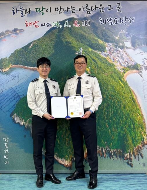 | ▲ 해남소방서 표정훈 소방교(왼 쪽)가 지난 5일 전남소방본부가 주관한 소방안전강사 경진대회에서 우수상을 수상한 후 기념촬영을 하고 있다. / 해남소방서 제공 |