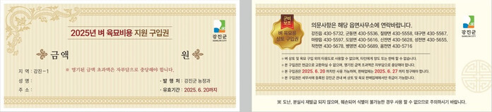 | ▲ 2025년 벼 육묘비용 지원 구입권 전면과 후면 이미지 / 강진군 제공 |