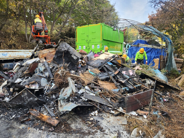 | ▲ 사회적협동조합 비지땀 초평동 비정형 주택 화재 수습 모습 /사진제공=의왕시 |