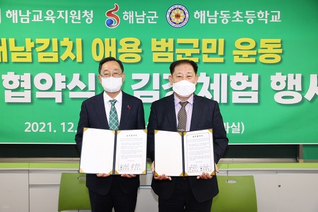 이날 행사에서는 협약의 의미를 담아 해남동초교 학생 26명 등 40여 명의 협약 참가자들이 해남김치의 우수성을 직접 체험하는 김장담그기 행사도 진행했다.