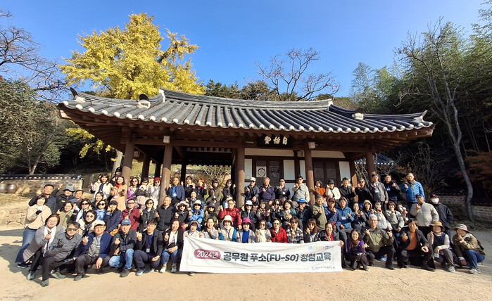 | ▲ 공무원 푸소 청렴교육 교육생들이 백운동원림 자이당에서 기념촬영 / 강진군 제공 |