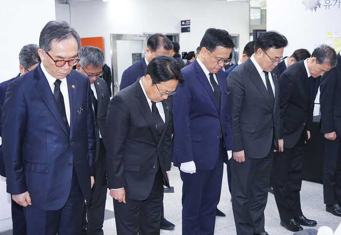강기정 광주시장과 최상목 대통령 권한대행 부총리 겸 기획재정부장관 등 정부대표단은 18일 오후 광주시 동구 전일빌딩245에 마련된 ‘12·29 제주항공 여객기 참사 합동분향소’를 찾아 희생자들을 추모했다.