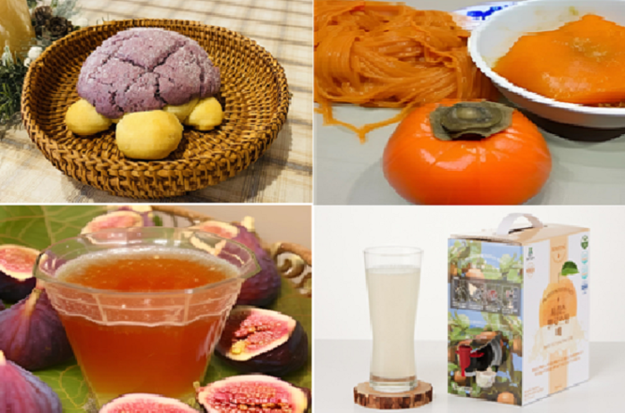 | ▲ 왼 쪽 상단부터 시계 방향으로 고구마무스, 대봉감소스, 무화과 콤푸차, 배음료 / 영암군 제공 |