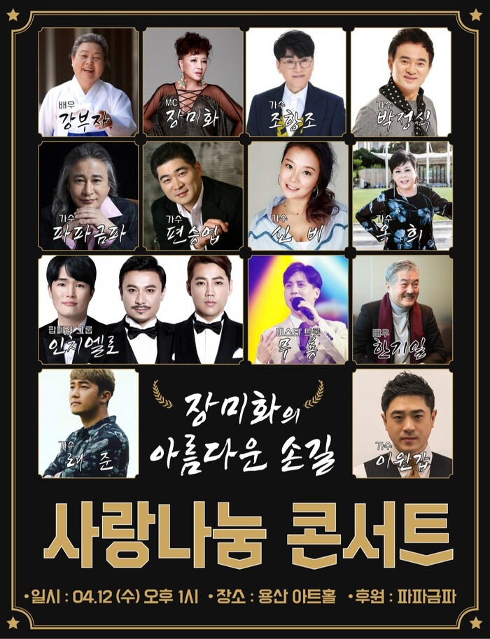 장미화의 아름다운 손길&파파금파가 주최하는 이번 행사에는 강부자, 한지일, 조항조, 옥희, 편승엽, 박정식 등 연예인들이 재능기부 공연을 진행할 예정이다.