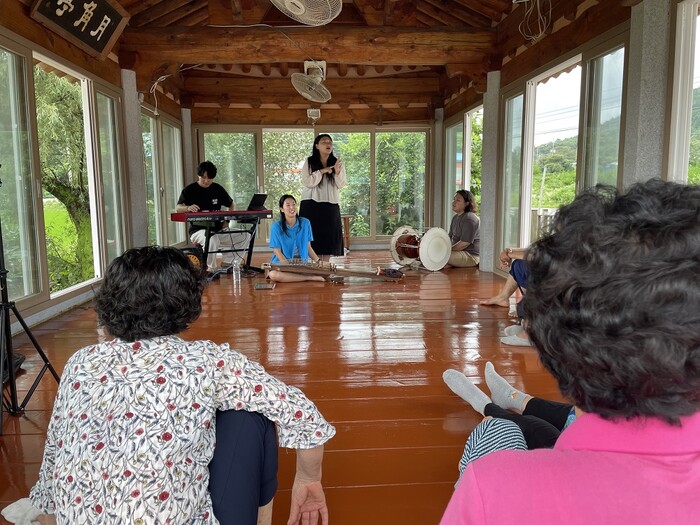 | ▲ 이현영, 최유빈 팀이 강진 성전면 대월리에서 마을 어르신들을 대상으로 ‘찾아가는 거리공연’을 진행하고 있다. / 강진군 제공 |