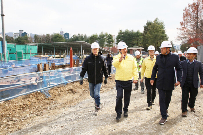 | ▲ 최대호 안양시장이 26일 청계통합정수장 고도정수처리시설 공사 현장을 방문해 진행상황을 점검하고 관계자들을 격려했다 /사진제공=안양시 |