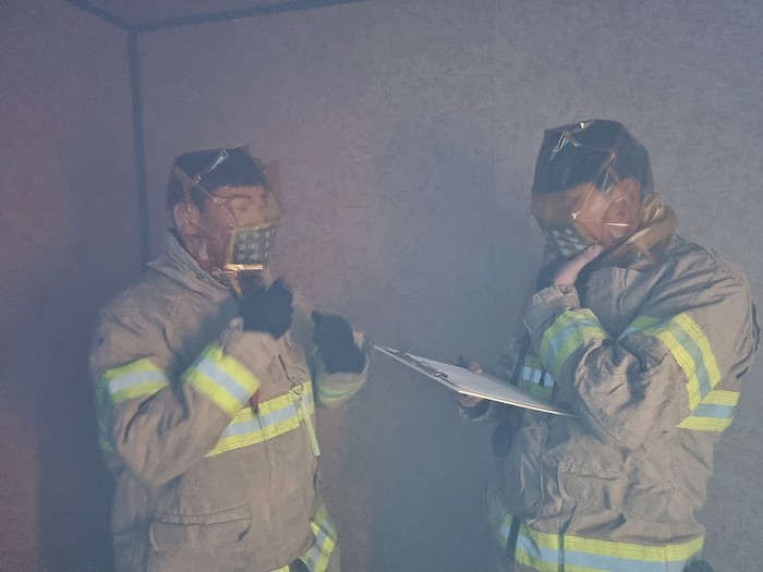 | ▲ 강진소방서 소방직원들이 지난 17일 강진소방서에서 연기를 피워 화재 현장을 재현한 가운데 방연마스크 제품 성능 시험 훈련을 하고 있다. / 강진소방서 제공 |