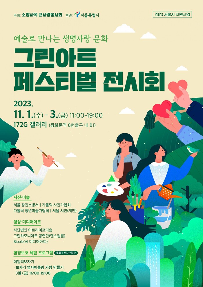 2023 ‘그린아트 페스티벌’ 전시회는 11월 1일(수)부터 3일(금)까지 광화문역사 내 172G갤러리에서 오전 11시부터 오후 7시까지 무료로 관람할 수 있다. 특히 3일에는 오후4시부터 보자기 업사이클링 가방 만들기, 실크스크린 에코 가방 만들기 체험 프로그램이 운영되어 누구나 무료(선착순 마감)로 참여할 수 있는 환경사랑 캠페인 프로그램도 참여할 수 있다.