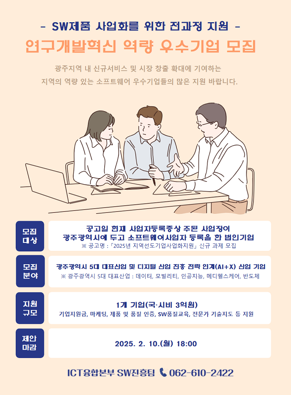 자세한 사항은 광주정보문화산업진흥원 누리집에서 확인할 수 있으며, 문의는 광주정보문화산업진흥원 SW진흥팀으로 하면 된다.