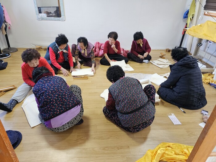 | ▲ 영암군 미암면 선황2구 마을 주민들이 마을경로당에서 전통수의 공동작업을 하고 있다. / 영암군 제공 |