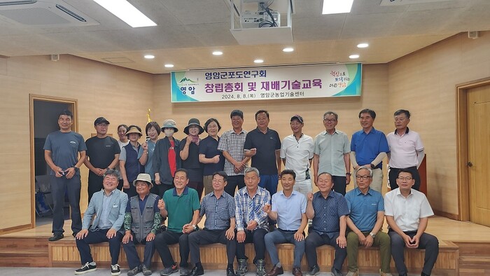 | ▲ 영암군 포도 농업인 30여 명, 지난 8일 농업기술센터에서 포도연구회 창립 기념촬영 / 영암군 제공 |
