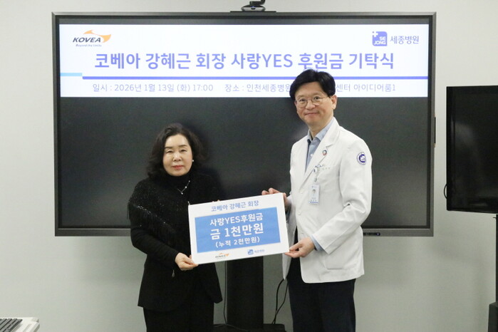 13일 인천세종병원 미래관에서 열린 기탁식에는 박진식 이사장, 민길현 행정지원부원장 등 세종병원 임직원과 코베아 강혜근 회장이 참석했다. 후원금은 향후 국내외 선천성 심장병 어린이 수술 및 치료 지원 등에 사용될 예정이다.
