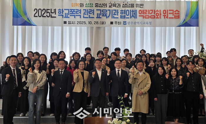 | ▲ 광주시교육청, 지난 28일 남구 한 컨벤션 센터에서 진행한 학교폭력 교육기관 대상 역량강화 워크숍에서 참가자들과 기념촬영. / 광주시교육청 제공 |