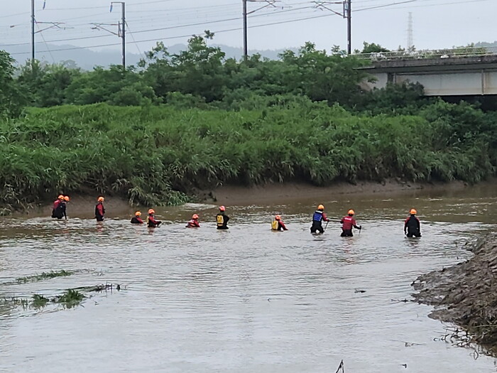 지상에서는 구조견 등을 활용해 강가 수풀림 주변을 중심으로 수색하고 헬기 드론 등을 활용한 공중 수색 활동도 진행했다.
