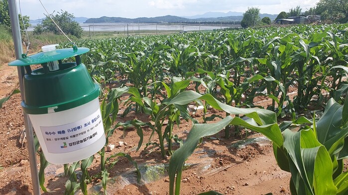 | ▲ 옥수수밭에 설치된 외래 해충인 열대거세미나방 예찰 트랩 / 강진군 제공 |