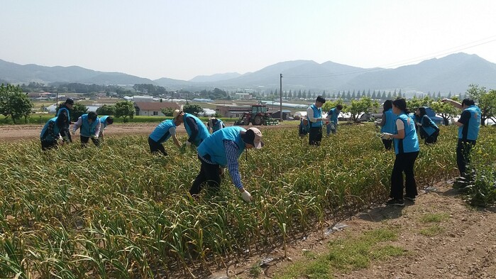 직원들은 이날 5월 들어 가장 무더운 날씨 속에서도 마늘 밭 1,010㎡(약 300평)에서 내 부모님을 도와 드린다는 마음으로 “마늘 쫑 뽑기와 잡초 제거” 봉사 활동에 임하며 구슬땀을 흘렸다.