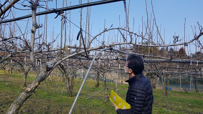 | ▲ 강진군 농업기술센터 관계자가 과수목 개화 상태를 살피고 있다. / 강진군 제공 |