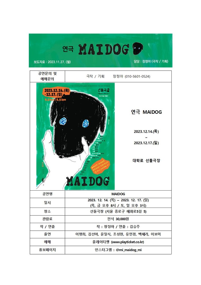 연극 은 14일부터 17일까지 평일 오후 8시, 주말 오후 3시에 대학로 선돌극장에서 진행되며, 플레이티켓을 통해 예매할 수 있다.