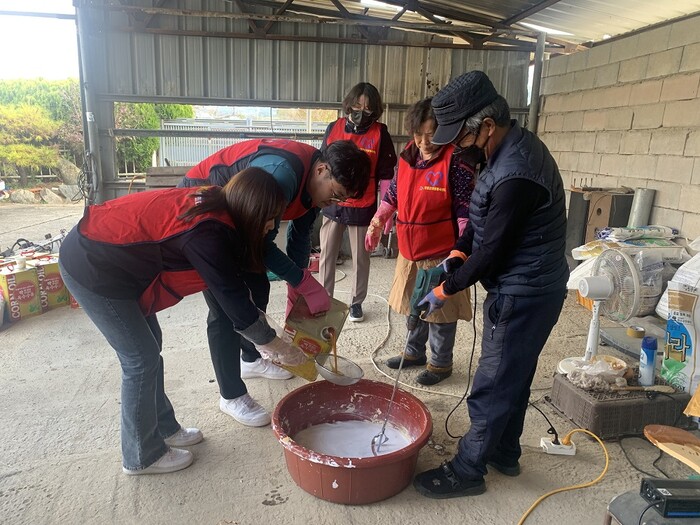 | ▲ 영암군재능나눔자원봉사센터, 지난 15일 미암면여성자원봉사협의회 회원, 군청 직원들과 치킨집 폐식용유 10통을 지원받아 친환경 재활용 비누 제조 / 영암군 제공 |