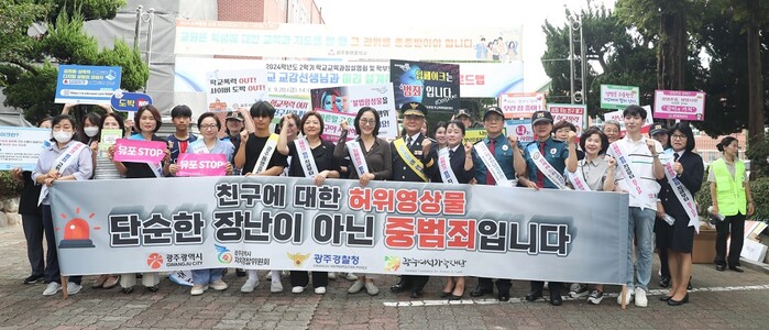 | ▲ 광주자치경찰, 11일 광주시, 광주교육청, 광주경찰청, 광주서부경찰서, 광주여성단체협의회, 광주전남여성단체연합, 광주YWCA, 광주여성가족재단, 세이프온 등과 청소년 허위영상물(딥페이크) 범죄예방 홍보 캠페인 / 광주광역시 제공 |