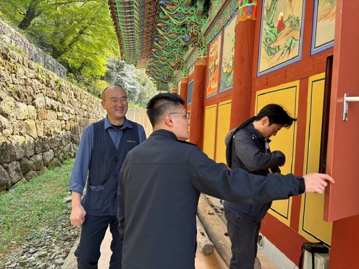 | ▲ 해남소방서 한충현 소방장(가운데)이 전기안전공사 관계자와 관내 전통사찰의 화재안전여부를 점검하고 있다. / 해남소방서 제공 |