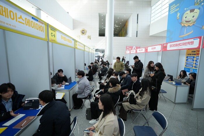 | ▲ 광주시청 시민홀에 마련된 부스에서 구직 상담을 하고 있는 청년들 / 광주광역시 제공 |