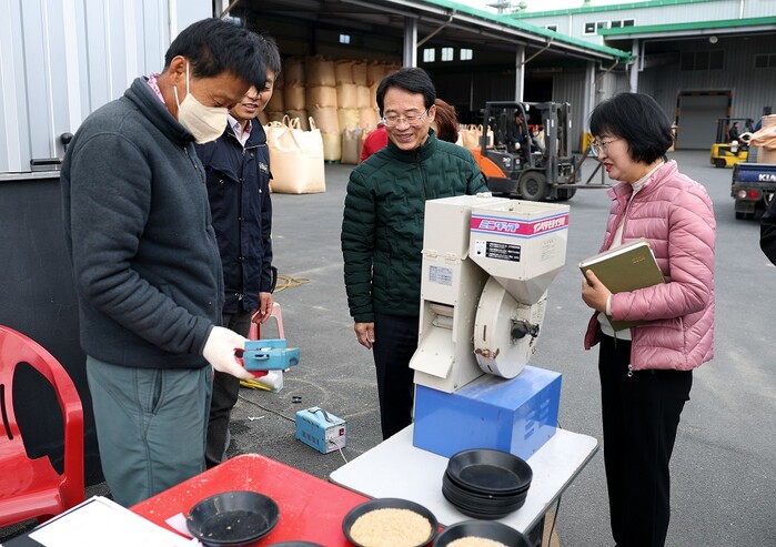 | ▲ 강진원 강진군수(사진 가운데)가 수매된 미호벼 품위를 살펴보고 있다. / 강진군 제공 |
