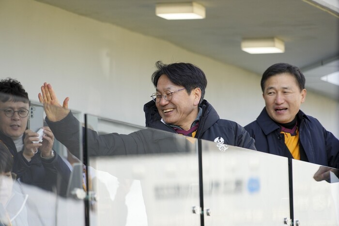 [광주=정찬남 기자] 강기정 광주광역시장이 지난 2일 오후 광주축구전용구장에서 열린 광주FC와 FC서울의 홈개막전에 참석해 개막식전 제1매표소에서 ‘스포츠와 함께 떠나는 문화마실’ 풍물 공연을 관람하고 있다./광주광역시 제공