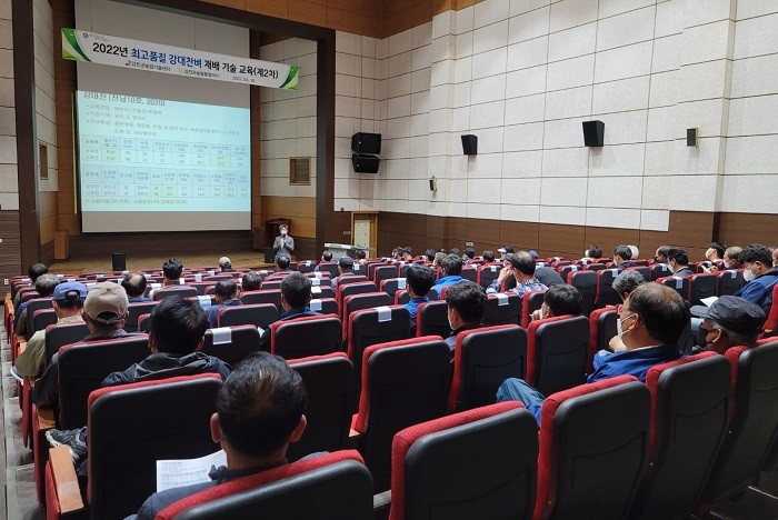 | ▲ 강진군, 지난 15일 농업기술센터에서 관내 벼 재배농가 대상 강대찬벼 차별화된 육성 전략 사업으로 쌀 시장 선점 위해 "제2차 안전 재배 기술교육" 실시 / 사진=강진군 제공 |