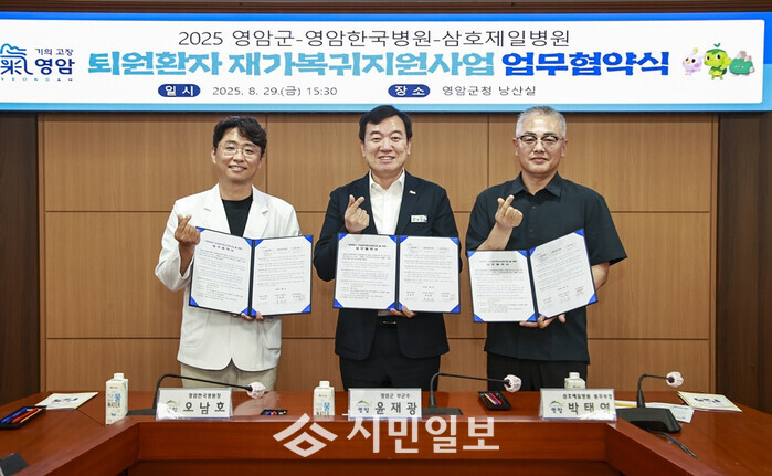 | ▲ 윤재광 영암군부군수(사진 가운데)가 지난 8월 29일 영암군청 낭산실에서 오남호 영암한국병원장, 이동준 삼호제일병원장과 ‘퇴원 환자 재가 복귀 지원사업’업무협약을 체결 한 후 기념촬영을 하고 있다. / 영암군 제공 |