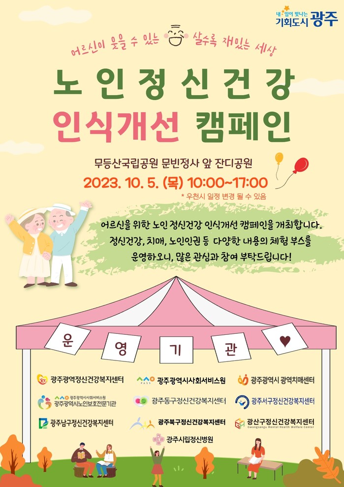 광주시가 주최하고 광주광역정신건강복지센터·광주광역시사회서비스원이 주관하는 합동캠페인은 10월 2일 ‘노인의 날’을 맞아 노인 정신건강 인식 개선 및 지역 노인복지서비스 홍보를 위해 5개 자치구 정신건강복지센터, 광주광역치매센터, 광주노인보호전문기관, 광주시립정신병원 등 10개 기관이 함께 한다.