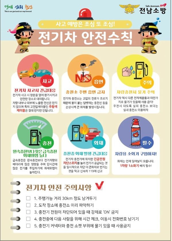 이에 따라 전남 강진소방서는 전기차 화재에 따른 자동차와 인명피해 최소화를 위해 전기차 충전시설 화재 예방대책 및 전기차 화재 예방을 위해 홍보에 나섰다.