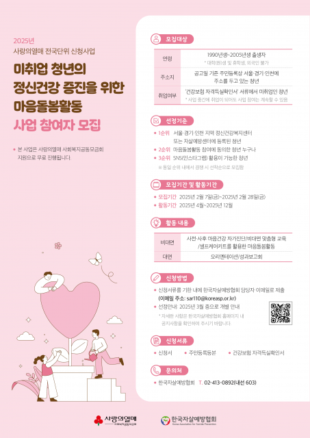 한국자살예방협회는 서울, 경기, 인천에 거주하는 미취업 청년(만 19세 이상부터 만 34세 이하)을 대상으로 마음돌봄활동을 운영할 계획이며, 해당 사업은 사랑의열매 사회복지공동모금회가 지원한다.