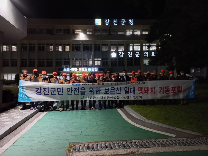 | ▲ 멧돼지 출몰로 군민들의 생명과 농작물 피해 방지를 위해 구성된 강진군 유해야생동물 피해방지단 기념촬영 / 강진군 제공 |
