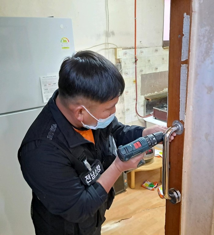 | ▲ 강진소방서 생활안전순찰대, 관내 어르신 가구에 안전 손잡이 설치 / 강진소방서 제공 |