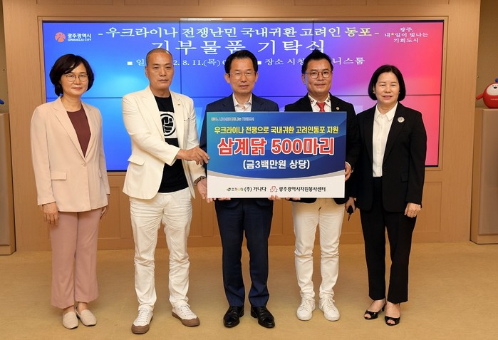 [광주=정찬남 기자] ㈜가나다는 우크라이나 전쟁으로 국내 귀환한 고려인 동포의 건강한 여름나기를 돕기 위해 보양식으로 삼계닭 500마리(300만 원 상당)를 기탁했다.