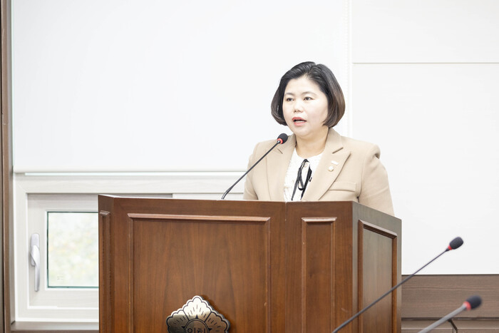 | ▲ 박은정 의원이 지난 11월 22일 열린 제286회 제2차 정례회 기획행정위원회에서 자신이 대표 발의한 안산시 소속위원회의 설치 및 운영에 관한 조례 일부개정조녜안에 대해 제안설명을 하고 있다. (사진=안산시의회 제공) |
