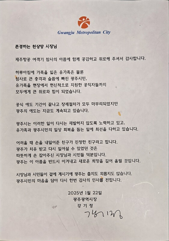 강기정 광주시장은 “제주항공 여객기 참사의 아픔에 함께 공감하고 위로해주셔서 희생자 유가족, 시민 등 모두에게 큰 위로와 힘이 됐다”며 “이러한 일이 다시는 재발하지 않도록 노력하는 한편 이들의 일상 회복을 돕는 일에 최선을 다하고 있다. 여러분 덕에 광주가 치유받고 다시 일어설 수 있었다”고 감사의 마음을 전했다.