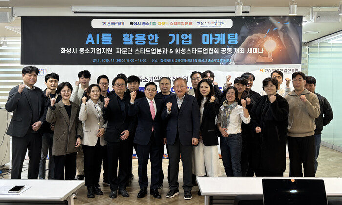 | ▲ 26일 열린 화성특례시 중소기업자문단 스타트업분과 _AI를 활용한 기업 마케팅 세미나_ 참석자들이 기념촬영을 하고 있다 /사진제공=화성특례시 |