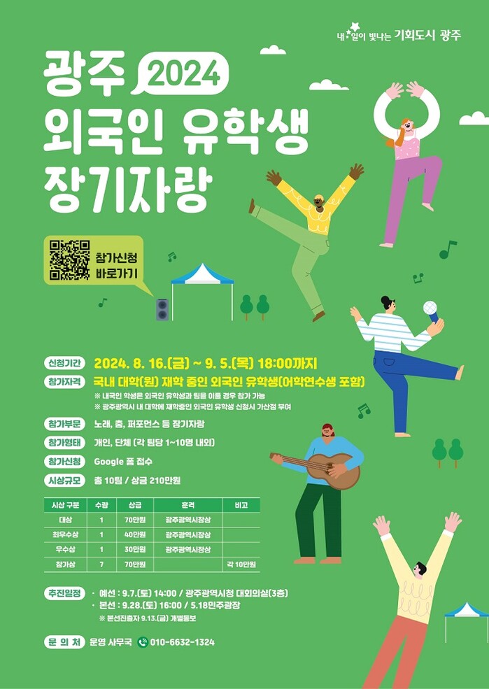 참가자는 오는 9월 7일 광주시청 대회의실에서 예선심사를 거쳐 9월 13일 본선 진출 10개 팀을 선발한다. 본선에 진출한 10개 팀은 오는 9월 28일 ‘외국인 유학생의 날’ 행사 당일 5·18민주광장 무대에서 경연을 펼친다.