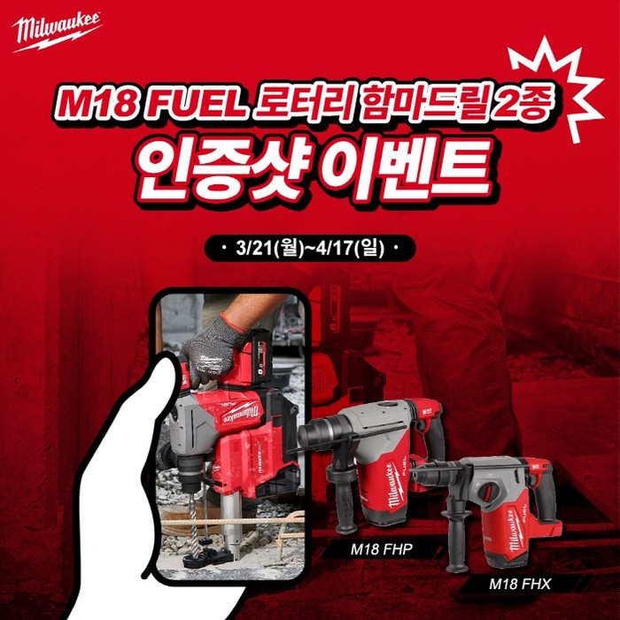 [시민일보 = 이승준 기자]밀워키(대표 박용범)는 신제품 ‘M18 FUEL SDS-Plus 로터리 함마드릴II 26mm(M18 FHX)’와 ‘32mm(M18 FHP)’를 구매했거나 앞으로 구매할 소비자들을 위해 ‘M18 FUEL 로터리 함마드릴2종 인증샷 이벤트’를 진행한다.